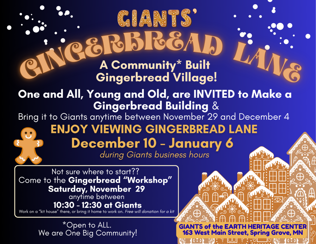 For more information please visit the exhibit page: https://giantsoftheearth.org/events/gingerbread-lane/